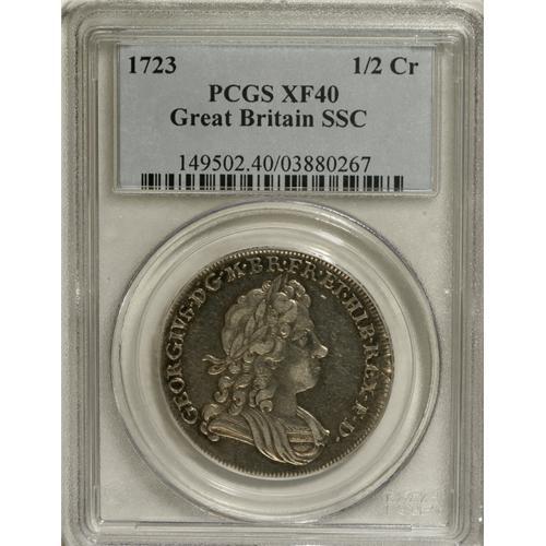 <B>George I Halfcrown 1723-SSC,</B></I> S-3643, XF40 PCGS, a bit light in color and having a few heavy marks in the obverse field, as well as flan adjustment right at the edge at 3 o'clock obverse. However, well struck with a pleasing portrait.<BR><BR><b>Shipping:</b> Coins & Currency (<a target="_blank" href="http://www.heritageauctions.com/common/shipping.php">view shipping information</a>)