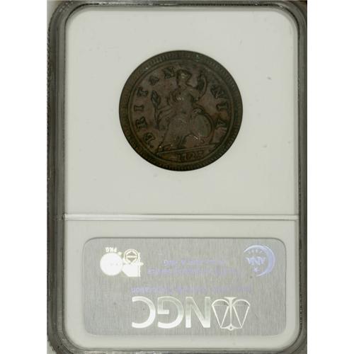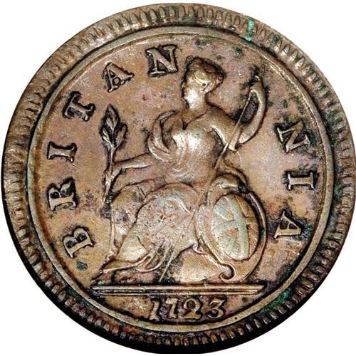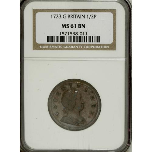 <B>George I Halfpenny 1723,</B></I> S-3660, MS61 BN NGC, an odd piece showing black verdigris in many areas and chocolate-colored patination, perhaps a touch of wear on high points but this is not easy to prove because of the nature of the surfaces. The centering is excellent, as is overall eye-appeal. Nicer than most seen, as this issue is typically loaded with flaws, even flan splits. Scarce.<BR><BR><b>Shipping:</b> Coins & Currency (<a target="_blank" href="http://www.heritageauctions.com/common/shipping.php">view shipping information</a>)