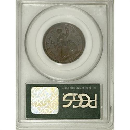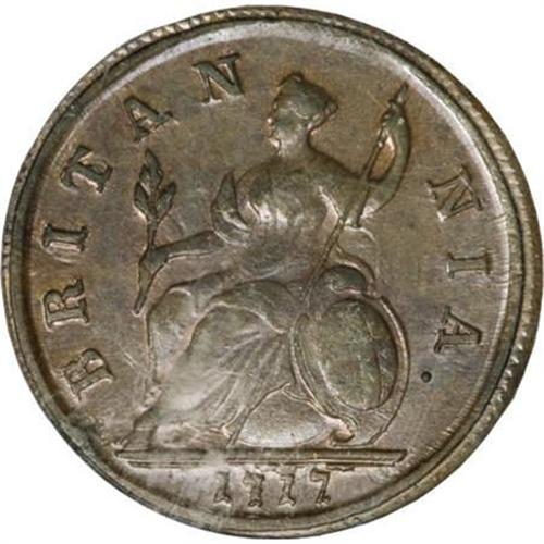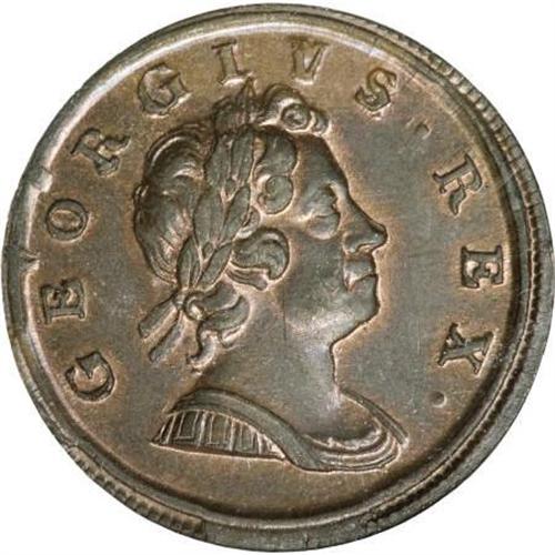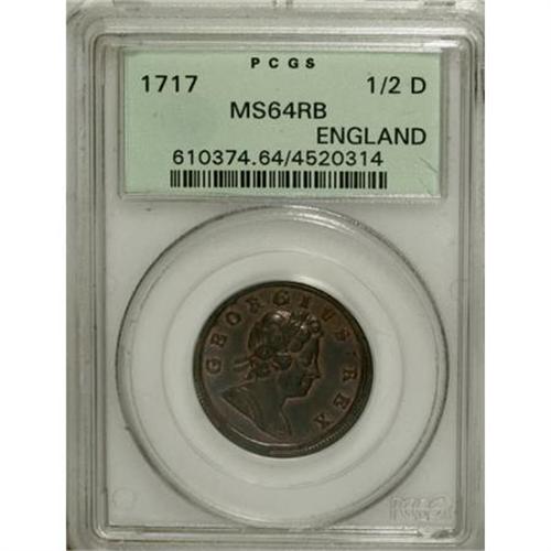 <B>George I copper Halfpenny 1717,</B></I> S-3659, "Dump" issue, stops, MS64 RB PCGS, deep reddish brown surfaces, red luster peeking out around devices, very scarce so nice.<BR><BR><b>Shipping:</b> Coins & Currency (<a target="_blank" href="http://www.heritageauctions.com/common/shipping.php">view shipping information</a>)