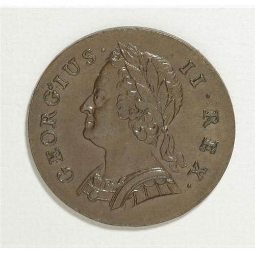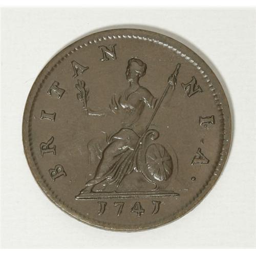<B>George II Farthing 1741,</B></I> S-3721, Choice AU, dark chocolate-brown surfaces that just do not get any nicer at this grade level, and well struck too.<BR><BR><b>Shipping:</b> Coins & Currency (<a target="_blank" href="http://www.heritageauctions.com/common/shipping.php">view shipping information</a>)