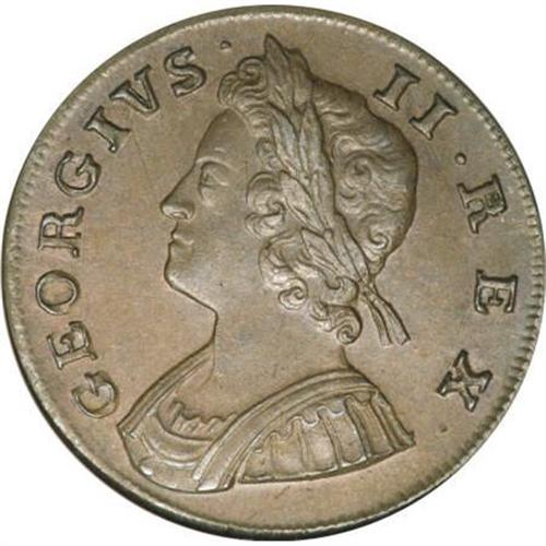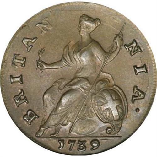 <B>George II copper Halfpenny 1739,</B></I> S-3713, young bust, last date of issue, "9" of date filled in, MS63 BN NGC, smooth chocolatey surfaces, pleasing.<BR><I>From The Madison Collection.</B></I><BR><BR><b>Shipping:</b> Coins & Currency (<a target="_blank" href="http://www.heritageauctions.com/common/shipping.php">view shipping information</a>)