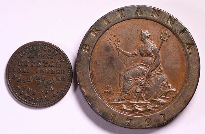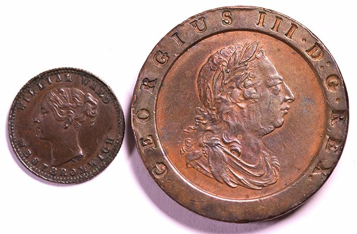 Great Britain, George III, Cartwheel Twopence, 1797, nice chocolate brown toning, few minor edge disturbances, else good very fine (S.3776); together with Great Britain, West Bromwich, William Ward, Farthing, Crystal soap powder advertising token, nice chocolate brown patina, graded as almost extremely fine (2 items)