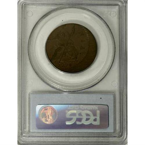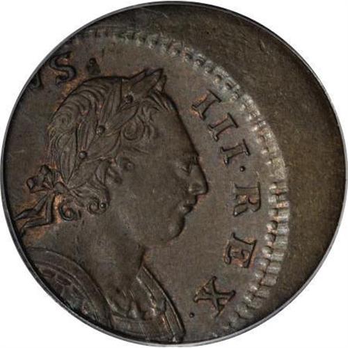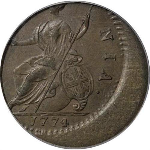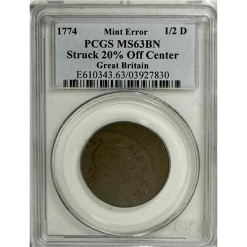 <B>George III copper error Halfpenny 1774,</B></I> S-3774, MS63 BN PCGS, designated "Struck 20% Off Center" on slab insert, a really exceptional and dramatic error, as our photos illustrate. A hint of mint red luster remains around some of the devices.<BR><BR><b>Shipping:</b> Coins & Currency (<a target="_blank" href="http://www.heritageauctions.com/common/shipping.php">view shipping information</a>)