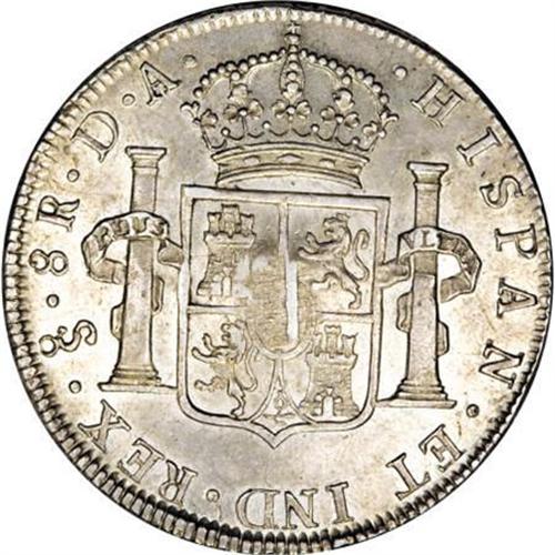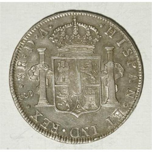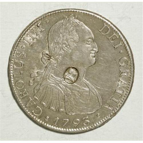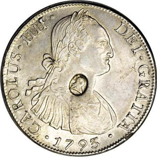 <B>George III counterstamped "Dollar"</B></I> <B>(circa 1797),</B></I> S-3765A, oval George III c/s on portrait 1793-So DA 8 reales of Chile -- a rarity, and in wonderful condition: Choice lustrous AU, satiny brilliance, small scratch across obverse field to right of portrait and a small rim-flaw at 5 o'clock obverse, but a delight of a specimen, the c/s deep and virtually as made. Normally we do not put the estimated date of manufacture, but the great emergency coinage of the Napoleonic Wars occurred about 1797 onward, until the 1804 issue, which also employed other countries' dollar-sized silver coins for re-issue under the authority of the Bank of England. This piece is a rarity!<BR><BR><b>Shipping:</b> Coins & Currency (<a target="_blank" href="http://www.heritageauctions.com/common/shipping.php">view shipping information</a>)