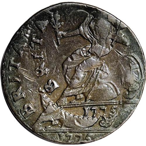 <B>George III double-struck error Halfpenny 1775,</B></I> S-3774. A dramatic error, as our photos show! Choice XF with dark chocolate-brown surfaces that are a delight to view because of their texture, although there are some marks and scuffs, evidence in fact that this coin did circulate, despite its extravagant appearance. Our estimate is a sheer guess. If two collectors "have to own" this wild and very special piece, who knows what the value could be? One chance, and then it's gone. Go find another!<BR><BR><b>Shipping:</b> Coins & Currency (<a target="_blank" href="http://www.heritageauctions.com/common/shipping.php">view shipping information</a>)