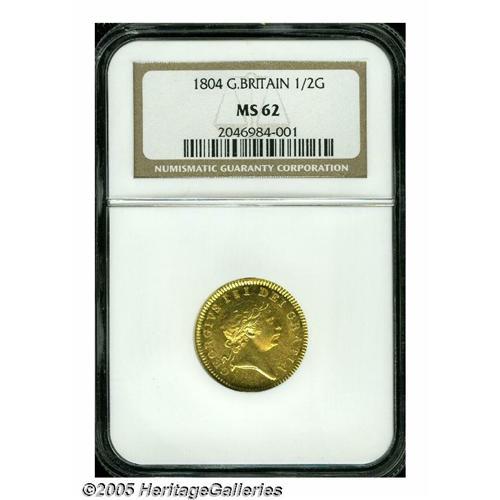 <B>George III gold 1/2 Guinea 1804, </B></I>KM651, MS62 NGC, fully lustrous and extremely bold, an unusually attractive example of this type.