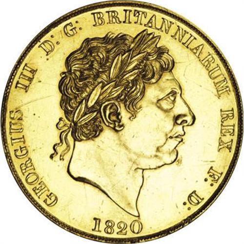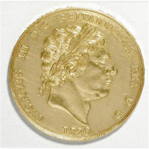 <B>George III pattern £2 1820,</B></I> S-3784, WR-179, engraved by Benedetto Pistrucci, his initials appearing to the far right in the reverse exergue; raised lettered edge reading "DECUS ET TUTAMEN. ANNO REGNI LX.", the stops being tiny cinquefoils. Rated R3 by Wilson & Rasmussen, or extremely rare. Beautiful proof details, complete to the tiniest design feature, fields somewhat reflective but having small scratches -- this was probably a study piece, examined many times by students of historical money. Catalogues in Spink for £17,500 in FDC. This example is not FDC by any means but nor is it unappealing -- in fact, quite the opposite, it is quite pleasing. We will make our estimate conservative, thinking that this coin should easily exceed it in this intense marketplace for truly rare coins -- few coins of any time or issuer are rarer of more beautifully conceived and designed than this classic, the prototype for later gold coins of this denomination, although none was made during the reign of George III.<BR><BR>As a prototype, this coin is of great importance among the New Coinage issues that commenced near the end of the long life of King George III. All were made on steam-driven coinage presses purchased by the Crown from Boulton and Watt's manufactory at Birmingham, the former Soho Mint, which did much coinage contracting for the Crown and others in the previous century. The machinery was transferred to the new mint building on Tower Hill, just northeast of the Tower of London, literally just outside its high stone walls. This is widely known and has often been mentioned in print. Less frequently noted is the obeisance on the coinage offered to his "boss" at the Royal Mint by the cantankerous Italian engraver of great talent, Pistrucci, who worked grudgingly under anyone, which makes his notation of "WWP" on the ground beneath the broken spear-end, to the left at the exergue on the reverse, all the more remarkable. The initials stood for William Wellesley-Pole, 3rd Earl of Mornington (a tube station is still named in his honor in Camdentown, London), an aristocratic elder brother of the Duke of Wellington who served in the political office of Master of the Mint from 1814 to 1823, a cabinet office. Near the end of his term at the Mint, he became a member of the House of Lords, and under King William IV he was postmaster-general of Great Britain. Much might be said about Pistrucci's placing of these initials on the new coins (it appears on the silver as well), and here they appear on one of the most important of Pistrucci's engraved specimens.<BR><BR><b>Shipping:</b> Coins & Currency (<a target="_blank" href="http://www.heritageauctions.com/common/shipping.php">view shipping information</a>)