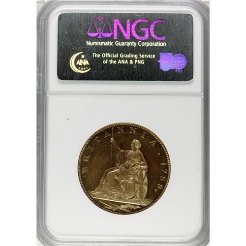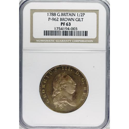 <B>George III pattern Halfpenny 1788,</B></I> P-982, brown gilt, PR63 NGC, a bit dull with some of the copper showing through, but these never look flashy.<BR><BR><b>Shipping:</b> Coins & Currency (<a target="_blank" href="http://www.heritageauctions.com/common/shipping.php">view shipping information</a>)