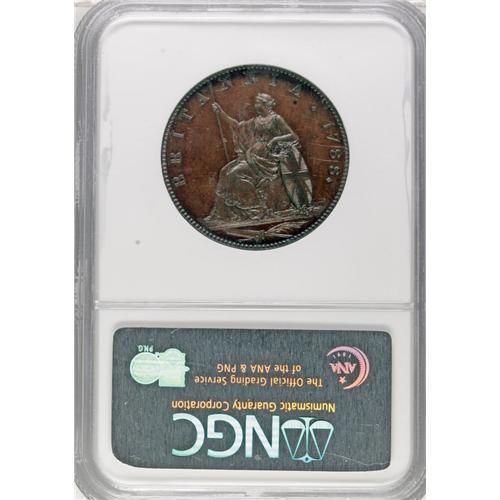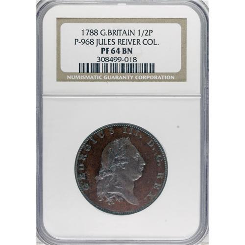 <B>George III pattern Halfpenny 1788,</B></I> P-968, bronzed, PR64 Jules Reiver NGC, very rare as a variety and this one is indeed lovely.<BR><BR><b>Shipping:</b> Coins & Currency (<a target="_blank" href="http://www.heritageauctions.com/common/shipping.php">view shipping information</a>)