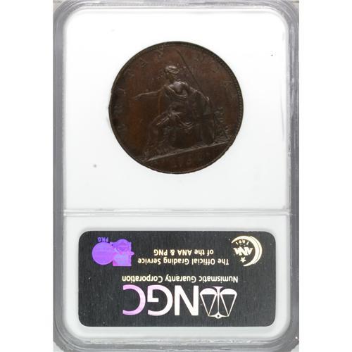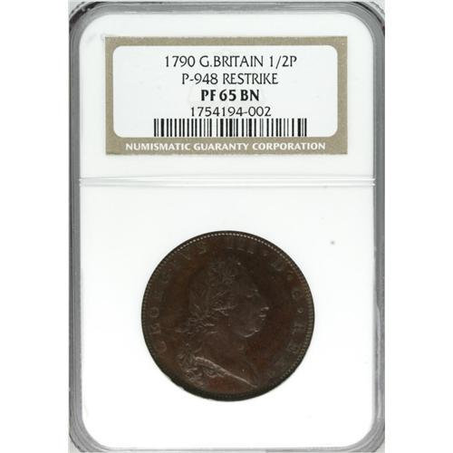 <B>George III pattern Halfpenny 1790,</B></I> P-948, PR65 NGC, bronzed and rated extremely rare as a variety by Peck, a beauty of a specimen!<BR><BR><b>Shipping:</b> Coins & Currency (<a target="_blank" href="http://www.heritageauctions.com/common/shipping.php">view shipping information</a>)
