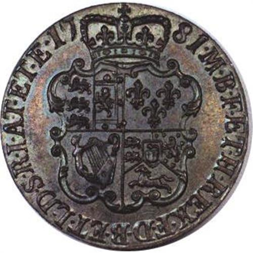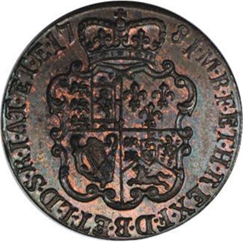 <B>George III pattern (?) copper Guinea 1781,</B></I> two reverses only, Rose type shields, struck out of collar but thicker than the last piece, Choice Proof with lovely red and brown surfaces. Probably another trial piece. Value uncertain but Rare. Should be of considerable interest!<BR><BR><b>Shipping:</b> Coins & Currency (<a target="_blank" href="http://www.heritageauctions.com/common/shipping.php">view shipping information</a>)