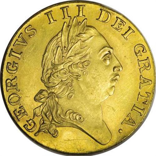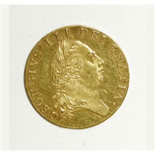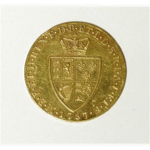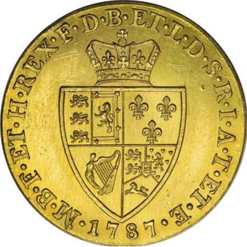 <B>George III proof Spade Guinea 1787, </B></I> S-3729, Wilson-Rasmussen #104 (R3), by Lewis Pingo, the usual variety seen in better collections, this one brilliant but having some handling marks and even some scratches in the reverse upper left field, yet handsome old-time gold toning. Comes with a Bebee's envelope calling it a pattern and marked $90.<BR><BR><b>Shipping:</b> Coins & Currency (<a target="_blank" href="http://www.heritageauctions.com/common/shipping.php">view shipping information</a>)