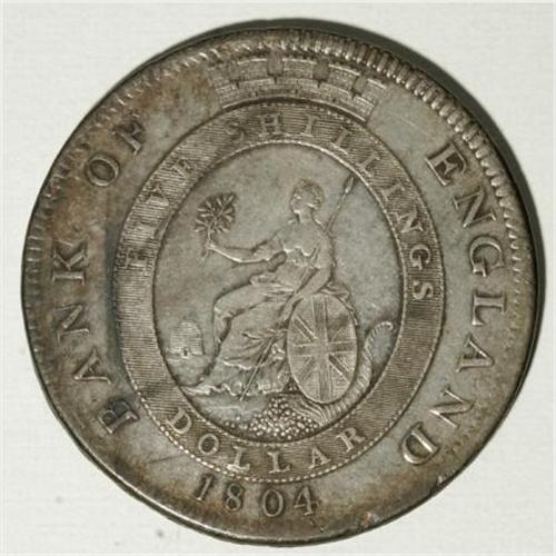 <B>George III silver Dollar 1804,</B></I> S-3768, Bank of England issue, the undertype or host coin clear in ghost form, Very Fine, somewhat splotchy silvery gold toning.<BR><BR><b>Shipping:</b> Coins & Currency (<a target="_blank" href="http://www.heritageauctions.com/common/shipping.php">view shipping information</a>)
