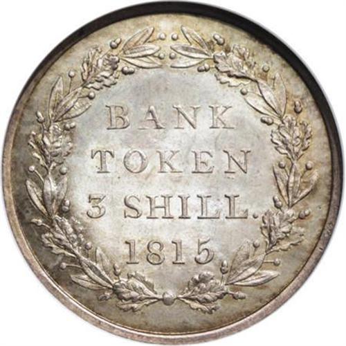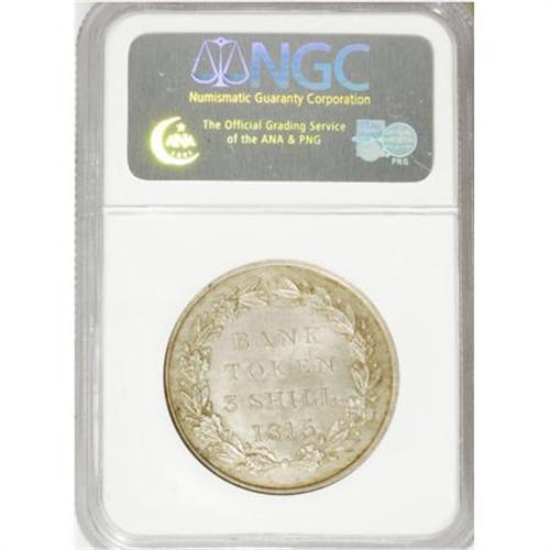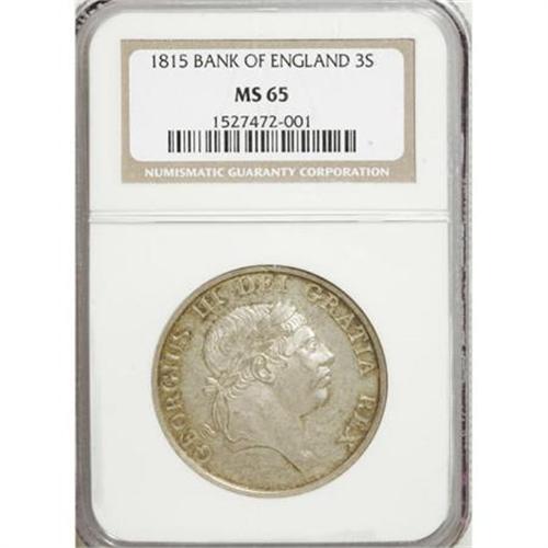 <B>George III silver token 3 Shillings 1815,</B></I> S-3770, large laureate head, MS65 NGC, a lovely piece, Gem Uncirculated graced by soft satiny luster beneath delicate golden brown toning, very smooth and even on both sides, sharp in strike, very scarce and always under-appreciated for its quality. Bank of England emergency coinage.<BR><BR><b>Shipping:</b> Coins & Currency (<a target="_blank" href="http://www.heritageauctions.com/common/shipping.php">view shipping information</a>)