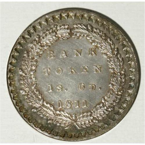 <B>George III token silver 18 Pence 1811,</B></I> S-3771, military bust, Choice Uncirculated, brilliant centers with dark iridescent toning on edge and rims. A handsome example of this Bank of England emergency coinage of the Napoleonic Wars era.<BR><BR><b>Shipping:</b> Coins & Currency (<a target="_blank" href="http://www.heritageauctions.com/common/shipping.php">view shipping information</a>)