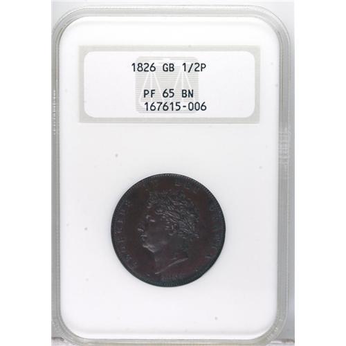 <B>George IV Proof Halfpenny 1826,</B></I> S-3824, PR65 BN NGC, bronzed Gem Proof with luscious mahogany-colored surfaces.<BR><BR><b>Shipping:</b> Coins & Currency (<a target="_blank" href="http://www.heritageauctions.com/common/shipping.php">view shipping information</a>)