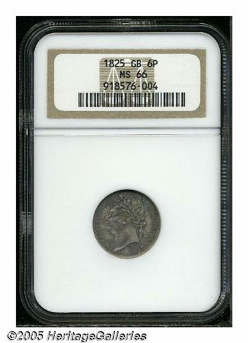 <B>George IV Sixpence 1825,</B></I> Laureate bust left/Crowned arms, S-3814, KM691, MS66 NGC. A sharply struck Gem with superb rose, blue, and gray toning.