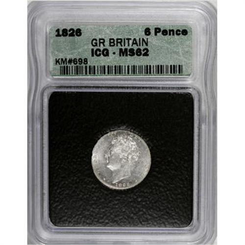 <B>George IV Sixpence 1826,</B></I> Bare Head, S-3815, MS62 ICG, bright silvery luster of certain appeal, combined with a crisp strike showing all the tiny details of the king's portrait as well as the lion's face! A nice coin.<BR><BR><b>Shipping:</b> Coins & Currency (<a target="_blank" href="http://www.heritageauctions.com/common/shipping.php">view shipping information</a>)