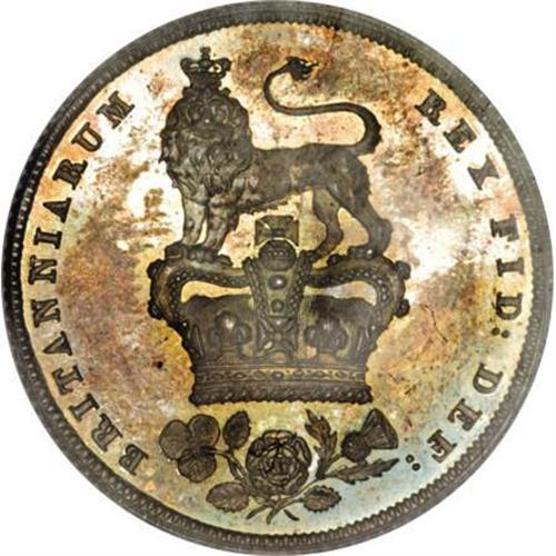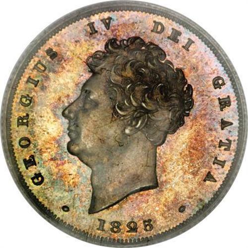 <B>George IV pattern "Lion" Shilling 1825,</B></I> Bare Head, Small Lion reverse, reeded edge, the prototype for the Bare Head coinage, this marvelously engraved specimen being distinguished on its reverse by a smaller (crowned) lion atop a large central crown -- different by being more compact than the image that appears on the currency issues which began in this year. ESC-1264, rated R5, extremely rare, just 5 to 10 pieces known, of which this splendid coin is very likely the finest extant (the cataloguer, BL, has seen only two others, one impaired and the other a PR60+ with drab toning). This coin: PR66 PCGS, a Superb Gem Proof with absolutely <I>marvelous </B></I>violet-gold iridescence on the obverse, mated with exquisite golden blue and silvery green iridescence on the reverse. A stunning classic of the Georgian Age. This wondrous specimen is a Terner Registry coin at PCGS, the highest graded -- and one of a kind for quality!<BR><BR><b>Shipping:</b> Coins & Currency (<a target="_blank" href="http://www.heritageauctions.com/common/shipping.php">view shipping information</a>)