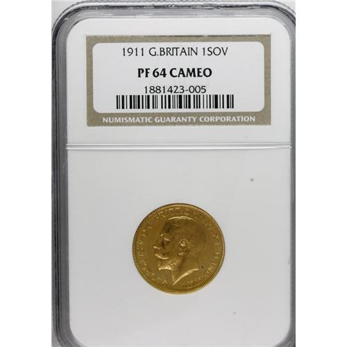 <B>George V Proof Sovereign 1911,</B></I> S-3996, PR64 Cameo NGC, another choice piece well worth having.<BR><BR><b>Shipping:</b> Coins & Currency (<a target="_blank" href="http://www.heritageauctions.com/common/shipping.php">view shipping information</a>)