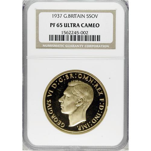 <B>George VI Proof 5-Pounds 1937,</B></I> S-4074, PR65 Ultra Cameo NGC, dramatic eye-appeal and truly gorgeous surfaces. Few exist so fine!<BR><BR><b>Shipping:</b> Coins & Currency (<a target="_blank" href="http://www.heritageauctions.com/common/shipping.php">view shipping information</a>)
