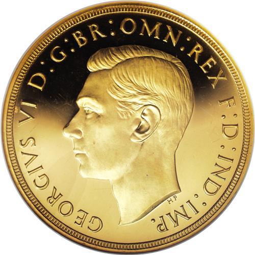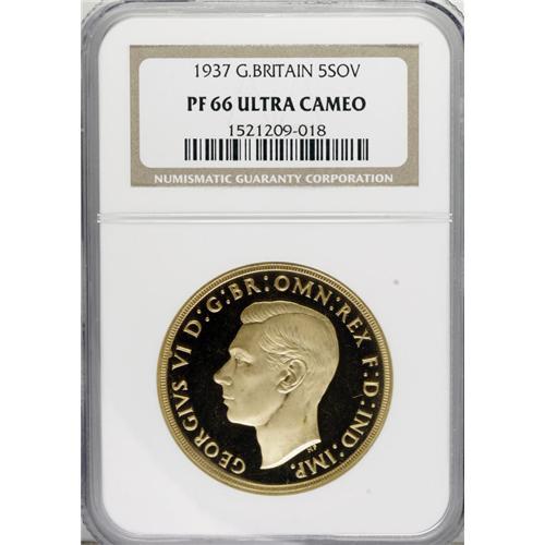 <B>George VI Proof 5-Pounds 1937,</B></I> S-4074, PR66 Ultra Cameo NGC, superb! Hard to believe, but even nicer than the last coin, which was very special. Here, the horse is also very frosted, providing for rare cameo contrast on the reverse side. Few exist at this quality level. A serious gold prize!<BR><BR><b>Shipping:</b> Coins & Currency (<a target="_blank" href="http://www.heritageauctions.com/common/shipping.php">view shipping information</a>)