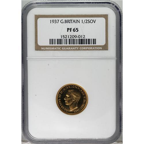 <B>George VI Proof Half Sovereign 1937,</B></I> S-4077, PR65 NGC, a seriously beautiful Gem Proof with a delicate cameo (not mentioned on the slab insert), far finer than most pieces seen in the sets.<BR><BR><b>Shipping:</b> Coins & Currency (<a target="_blank" href="http://www.heritageauctions.com/common/shipping.php">view shipping information</a>)