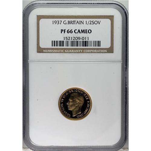 <B>George VI Proof Half Sovereign 1937,</B></I> S-4077, PR66 Cameo NGC, another true gem, this one heavily contrasted not just on the portrait but also (very unusual!) on the horse. Drop-dead quality, worth premium bids for sure.<BR><BR><b>Shipping:</b> Coins & Currency (<a target="_blank" href="http://www.heritageauctions.com/common/shipping.php">view shipping information</a>)
