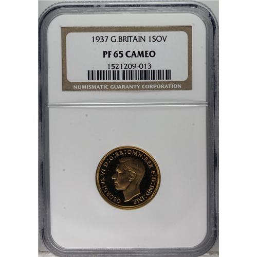 <B>George VI Proof Sovereign 1937,</B></I> S-4076, PR65 Cameo NGC, a beautiful piece with the portrait frosted, but not the horse (typical, as the horse rarely has any cameo contrast to it). The only sovereign from the London mint of this reign.<BR><BR><b>Shipping:</b> Coins & Currency (<a target="_blank" href="http://www.heritageauctions.com/common/shipping.php">view shipping information</a>)