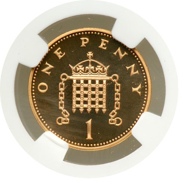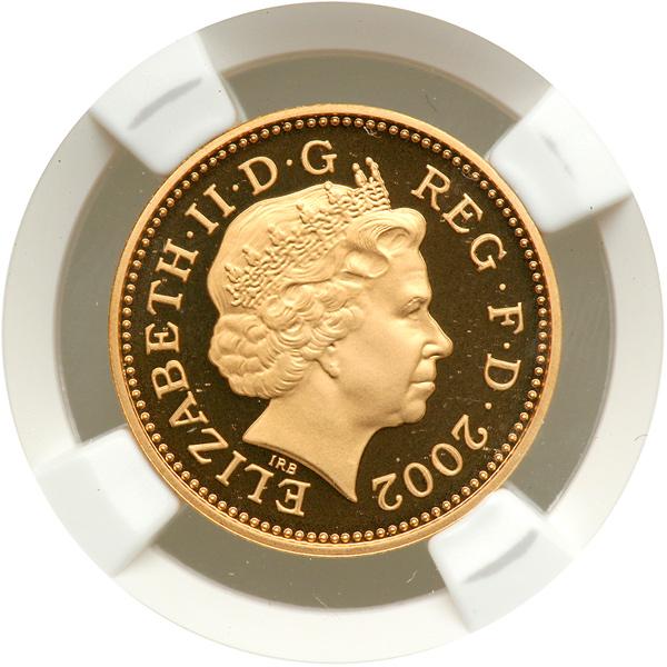 Great Britain. Gold Penny, 2002. Elizabeth II. Ian Rank Broadley's crowned portrait of HM Queen facing right. Reverse: Crowned portcullis, numeral 1 and ONE PENNY. This spectacular striking in gold is normally only available in the complete 13-coin gold proof set issued to celebrate Her Majesty's Golden Jubilee. A very rare opportunity for the Penny collector! NGC graded Proof 69 Ultra Cameo.