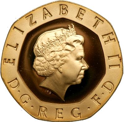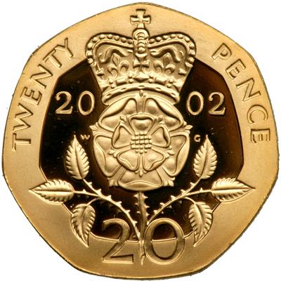 Great Britain. Gold Proof 20 Pence, 2002. S.4630 (PGJS1). Elizabeth II, 1952 to present. Proof struck in 22 carat gold. Obverse: Ian Rank Broadley's crowned portrait of HM Queen facing right ELIZABETH II D.G. REG. F.D.incuse into outer rim Reverse: Crowned rose date numerals on either side and TWENTY PENCE incuse into outer rim. Normally only available in the gold proof set issued to commemorate Her Majesty's Golden Jubilee, this is a rare chance to buy the only reasonably-priced florin or 20 pence struck in gold! A beautifully frosted specimen. NGC graded Proof 69 Ultra Cameo.