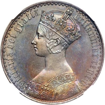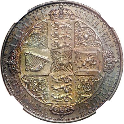 Great Britain. Gothic Crown, 1847. S.3883; ESC-288; Dav-106; KM-744. Edge, Un Decimo. Victoria. Crowned young bust of Queen wearing decorated dress. Reverse: Crowned cruciform shield with intricate background design, date in Latin numerals, all in Gothic script. Lovely iridescent toning with nice eye appeal. In a new NGC 4 prong holder. NGC graded Proof 63.