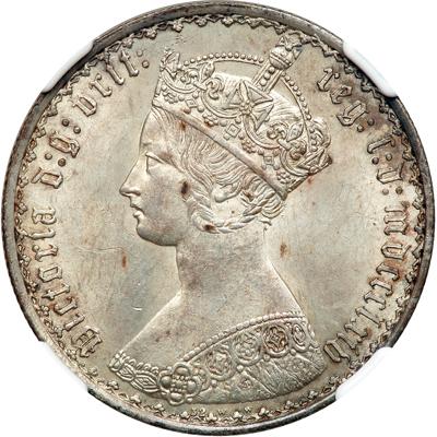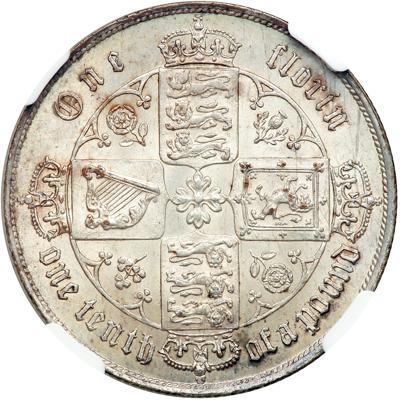 Great Britain. Gothic Florin, 1864. S.3892; ESC-824; KM-746.3. Victoria. In a new NGC 4 prong holder. NGC graded MS-62.