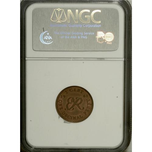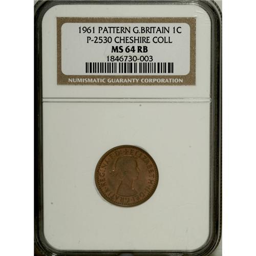 <B>Elizabeth II pattern Decimal Penny 1961,</B></I> P-2530, MS64 RB "Cheshire Collection" NGC, a landmark piece conceived as a possibility to replace the Wren Farthing, then in circulation in the UK, as the new decimal coinage was coming (another decade away but long in planning). The reverse monogram was never used, but is reminiscent of the sixpence pieces of George VI, the queen's father. This piece is the very last coin listed in Peck's reference; at the time he had no idea how rare it would be, so he gave no rarity rating; now it is known to be extremely rare. An important modern pattern, and very beautiful in quality, nearly full red and essentially a gem.<BR><BR><b>Shipping:</b> Coins & Currency (<a target="_blank" href="http://www.heritageauctions.com/common/shipping.php">view shipping information</a>)