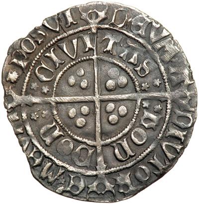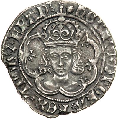 Great Britain. Groat, ND. S.2198A. Henry VII, 1485-1509. London mint. Mint mark, escallop. Obverse: Facing crowned bust of King with realistic hair. Reverse: Cross over concentric circular design. Minor environmental damage. Otherwise a wonderful semi-realistic portrait, this somewhat scarcer type Groat has a light even tone and well struck detail. Extremely Fine.