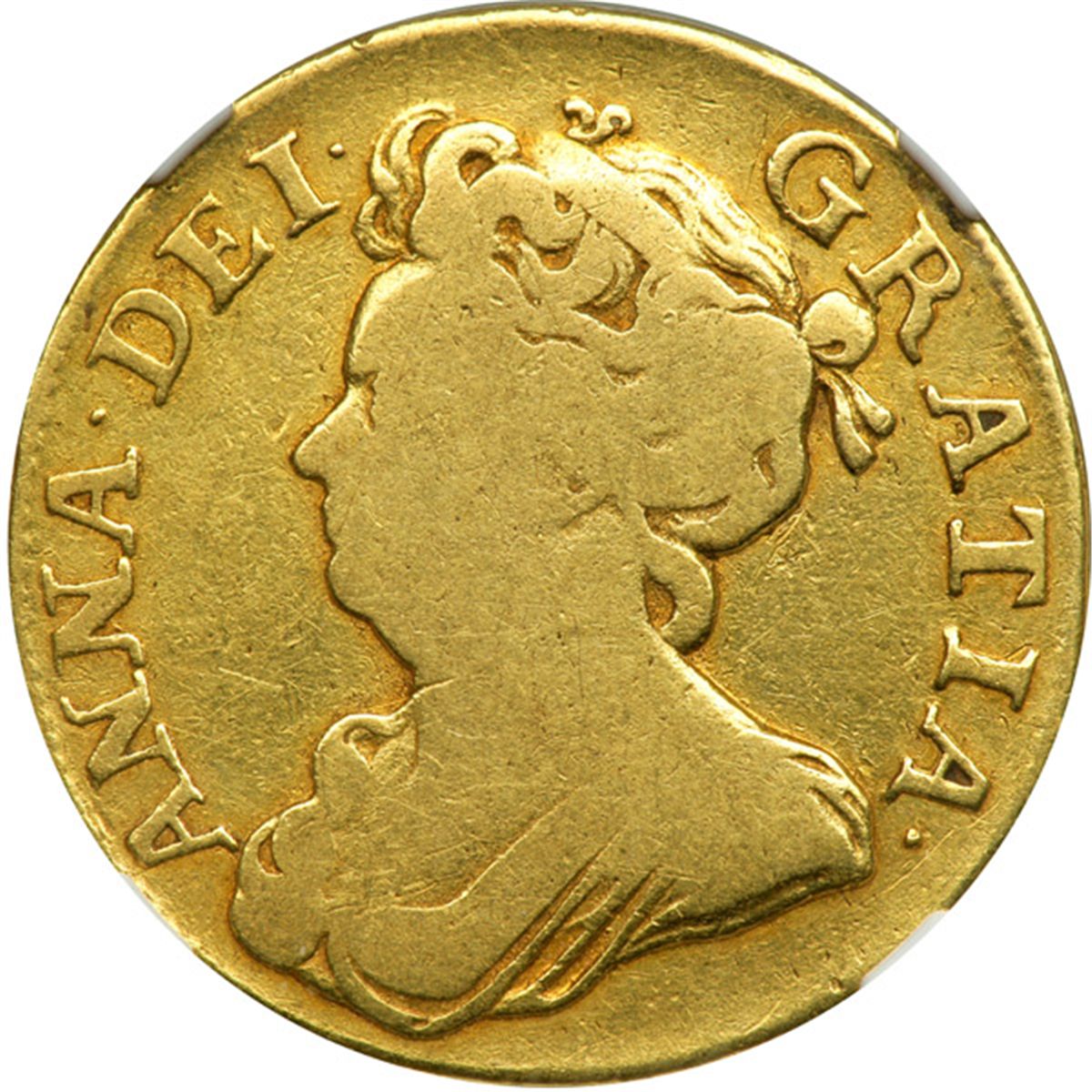 Great Britain. Guinea, 1708. S.3570; Fr-320. Anne, 1702-1714. First bust left. Reverse: Crowned cruciform shields with scepters in angles. NGC graded Very Good, Details (Reverse Scratched).