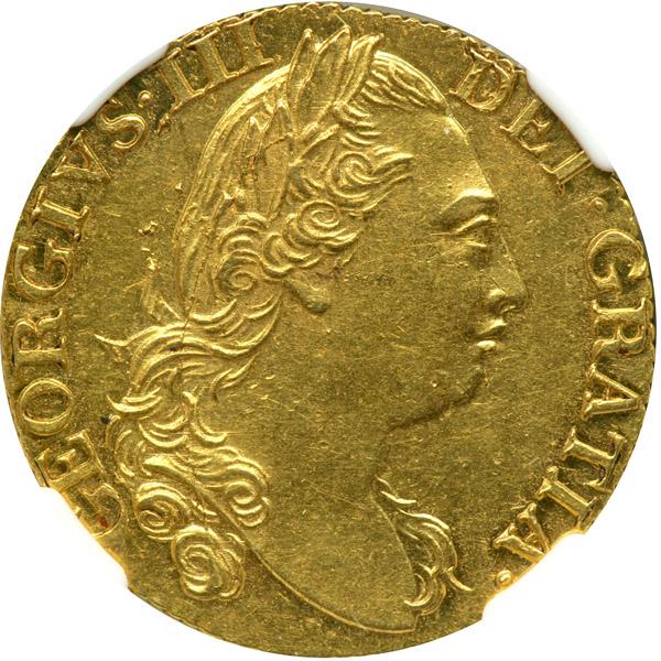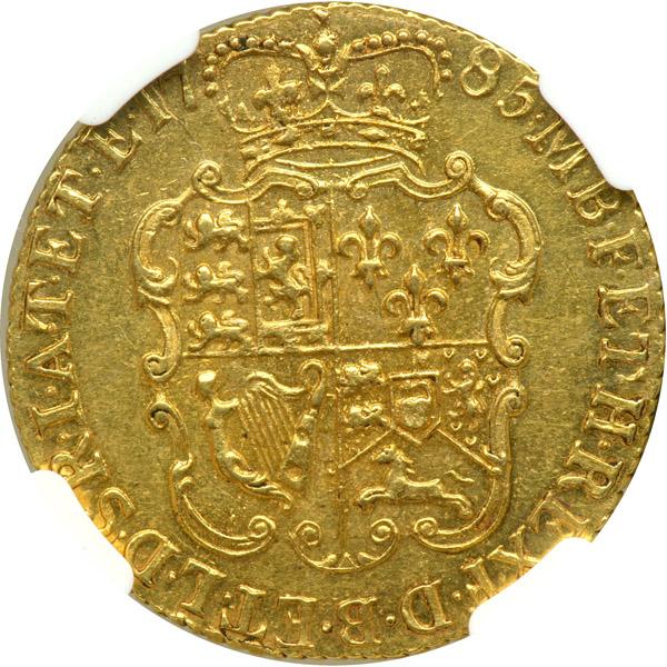Great Britain. Guinea, 1785. S.3728; Fr-355; KM-604. George III, 1760-1820. Obverse: Fourth laureate coinage portrait of King. Reverse: Crowned shield of arms. A pleasingly lustrous coin with good eye appeal. Guineas of this period are gaining in popularity. NGC graded AU-58.