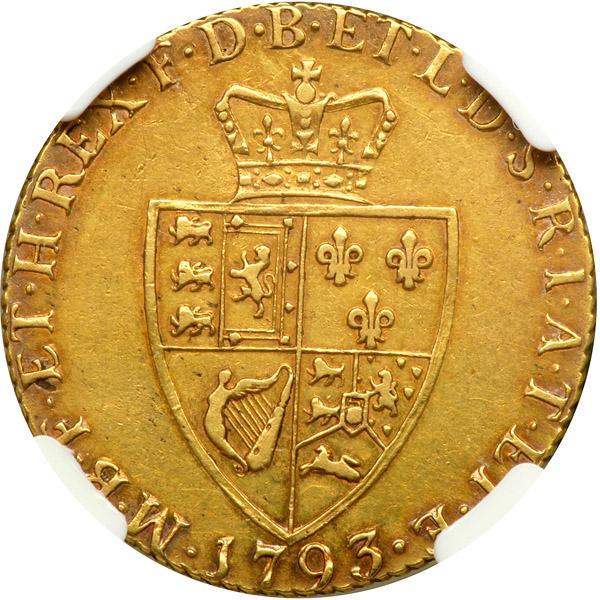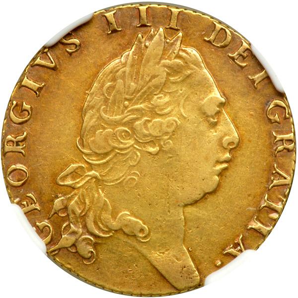 Great Britain. Guinea, 1793. S.3729; Fr-356; KM-609. George III. Laureate head right. Reverse: Spade shaped shield. NGC graded VF-35.