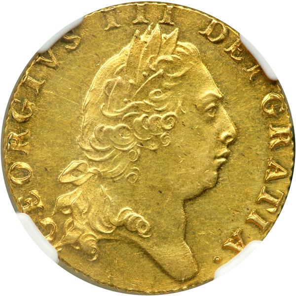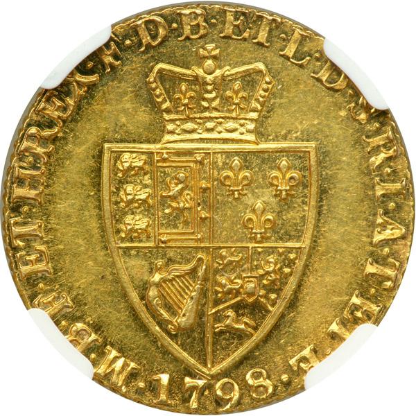 Great Britain. Guinea, 1798. S.3729; Fr-356; KM-609. George III. 5th Head. Reverse Spade-shaped shield. Lustrous. NGC graded AU-55.