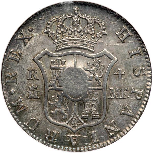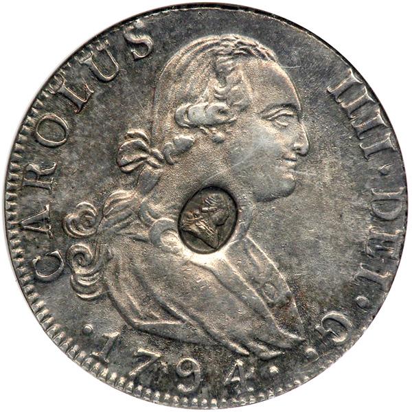 Great Britain. Half Dollar, ND (c.1797). S. 3767; ESC-611. George III, oval counterstamp on a Madrid 1794 MF 4 Reales. Much rarer in grade than the dollar. Lovely original old iridescent toning. NGC graded AU-55.