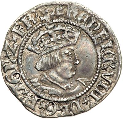 Great Britain. Half Groat, ND. S.2344. Henry VIII, 1509-1547. Canterbury mint. Archbishop Warham. Obverse: Bust of King right. Reverse: CIVITAS CANTOR, plain by shield. Lightly cleaned. A superb portrait of one of English history's most celebrated monarchs, and an overall well struck, lightly toned piece. Extremely Fine.