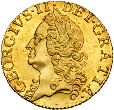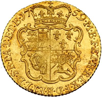 Great Britain. Half Guinea, 1759. S.3685; Fr-349; KM-587. George II, 1727-1760. Obverse: Old laureate head of King left. Reverse: Crowned quartered shield of arms. Edge obliquely grained. A minor buff mark on face. A very high grade example of an obtainable date. Lustrous and better made than most examples of this coin, struck in the penultimate year in the reign of George II. About Uncirculated.