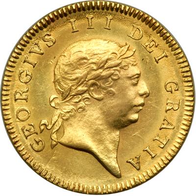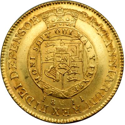Great Britain. Half Guinea, 1811. S.3737; Fr-364a; KM-651. George III, 1760-1820. Obverse: Seventh laureate head of King, with short hair, facing right. Reverse: Crowned shield within garter, date below. Lightly cleaned. A glistering example of the rarest obtainable date in the eight year series (only the 1805 is rarer, but this is seldom seen). Very rare in high grade. About Uncirculated.