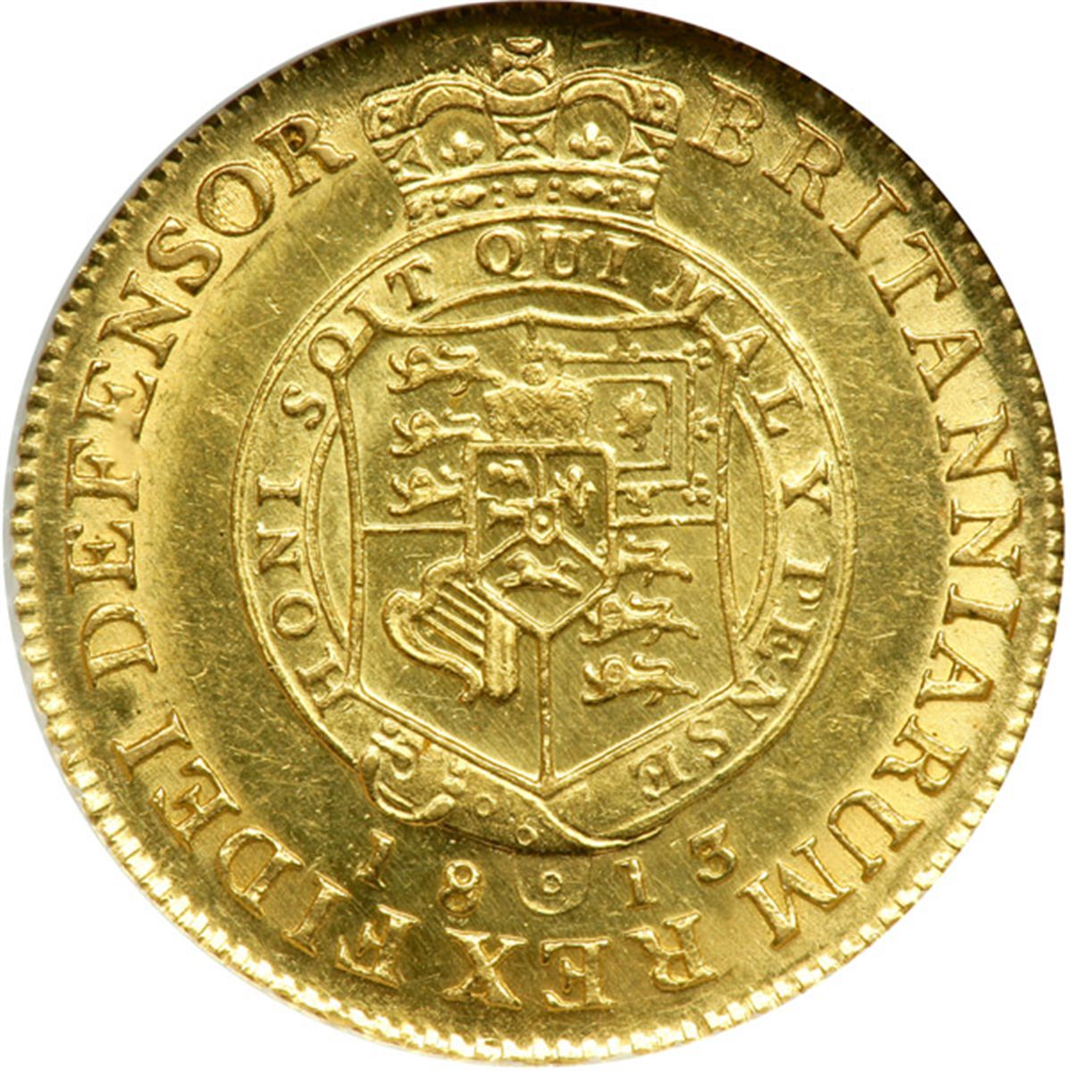 Great Britain. Half Guinea, 1813. S.3737; Fr-364; KM-651. George III, 1760-1820. 7th Head, military style. Last year of this type. Obverse: Laureate bust of king right. Reverse: Shield in garter. Nice lustrous example of this scarce date. NGC graded MS-62.