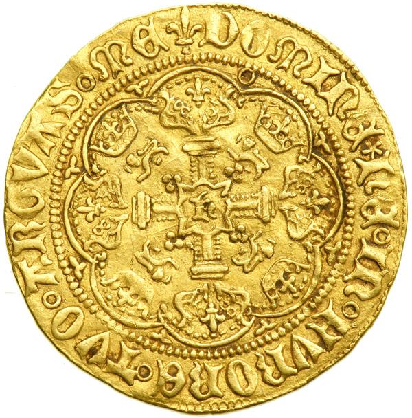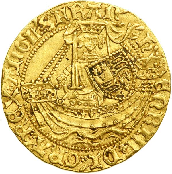 Great Britain. Half Noble, ND. S.1805; Fr-113. Henry VI, First Reign, 1422-1461. Annulet issue. London mint. King standing facing in ship, bearing sword and shield, annulet at sword arm. Reverse: Floriated cross, h in center. Mint mark lis. Scratch across face. NGC graded EF-40.