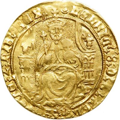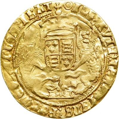 Great Britain. Half Sovereign, ND. S.2295; Fr-167. Henry VIII (1509-1547) Half Sovereign. Tower Mint. Mint mark pellet in annulet. Extra annulet on inner circle on reverse. Obverse: King seated on throne facing, holding orb and scepter. Reverse: Crowned Tudor shield of arms with supporters. H R below. Nice portrait and some sharp struck areas of design on this notoriously weakly struck coin. Well centered and a little original luster. A scarcer variety. Struck 1544-1547 during the last three years of the King's reign. Removed from mount. Very Fine to Extremely Fine.
