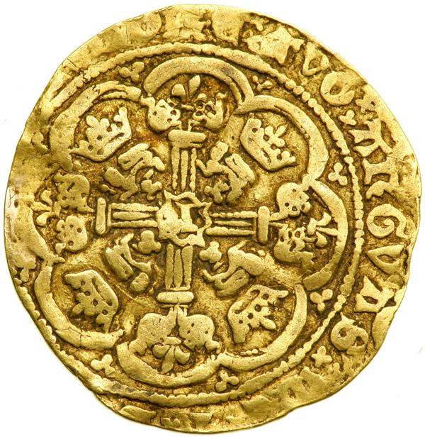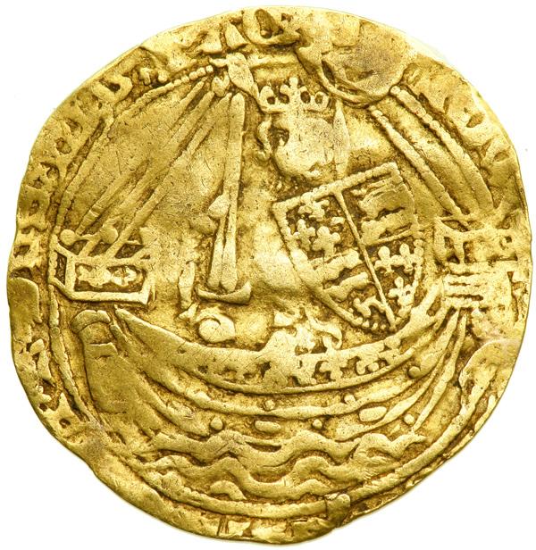Great Britain. Half-noble, ND. S.1819/1825? 3.55 grams. Henry VI, 1422-1461. Ruler in ship. Reverse: Ornamental cross with h in center. Well worn with clipped edges. Very Good.