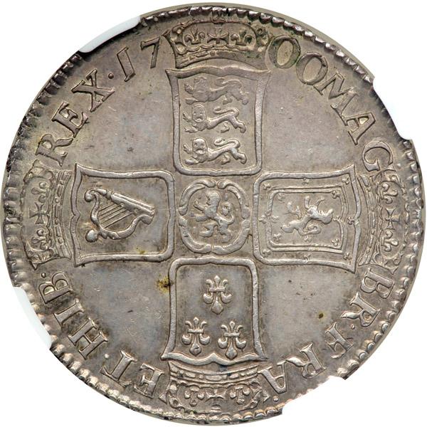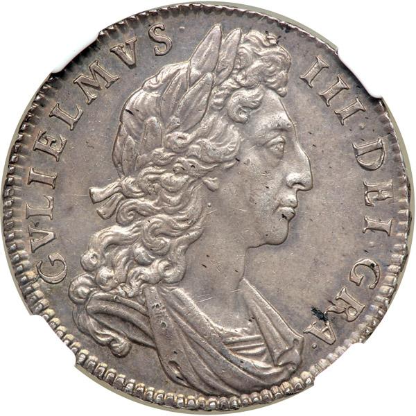 Great Britain. Halfcrown, 1700. S.3494; ESC-561. William III, 1694-1702. Draped laureate bust. Reverse: Crowned cruciform shields. DVODECIMO on edge in raised letters. Beautifully toned in shades of green and gold, with sharply struck detail on the portrait. No evidence of any blank filing, or the weaknesses which are often encountered on these pieces. NGC graded MS-62.