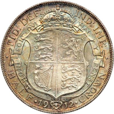 Great Britain. Halfcrown, 1912. S.4011; KM-818.1. George V, 1910-1936. A beautiful piece bathed in rainbow toning and probably much rarer in this condition than some of the Halfcrowns of Edward VII. Choice Uncirculated.