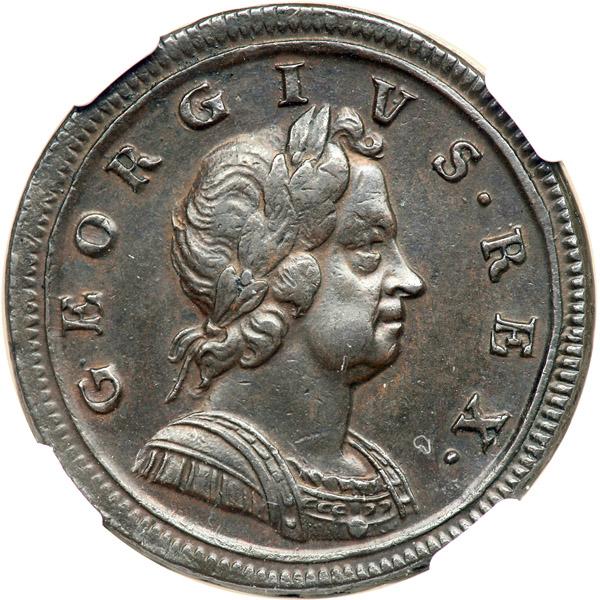 Great Britain. Halfpenny, 1719. S.3660. George I. Second issue. Laureate head right. Reverse: Britannia seated left. Spink catalog value in extremely fine is 900£ (approximately $1400). A lovely example with a trace of original mint luster.